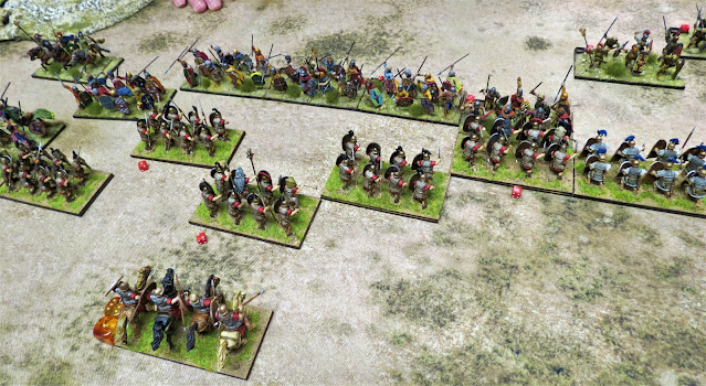 The main action happened over on the Roman right flank. Low quality Roman auxiliaries faced the lighter Spanish foot and a large force of Spanish skirmishing cavalry. The Romans took some losses, but managed to rout the Spanish cavalry, demoralise the caetrati and push on into a position to turn in on the Spanish centre. As WW commented, in the Warband Historical rules once units are locked in melee, its hard then to react to breakthroughs without uncommitted reserves. Some tactical insight to consider for future games!